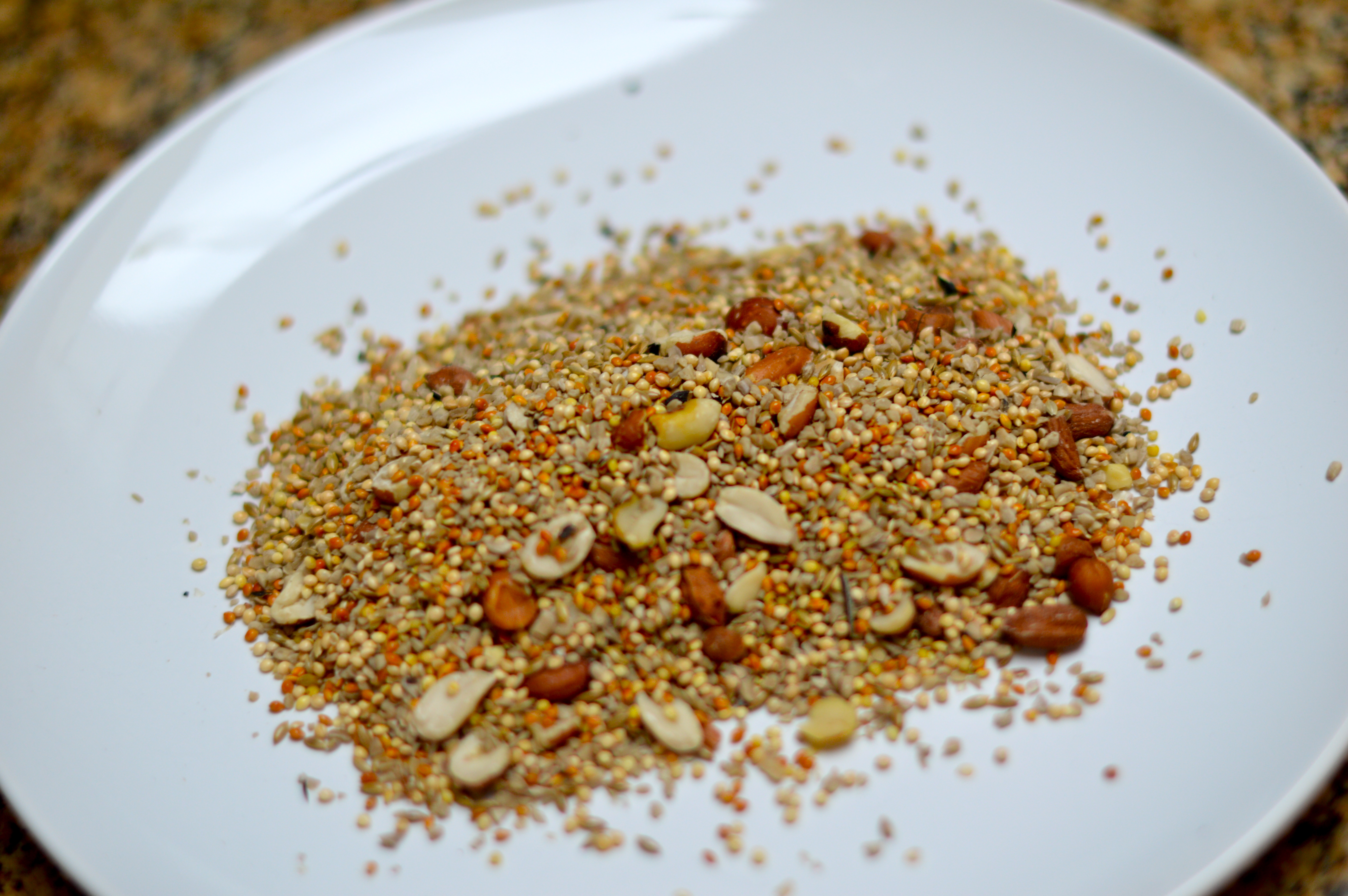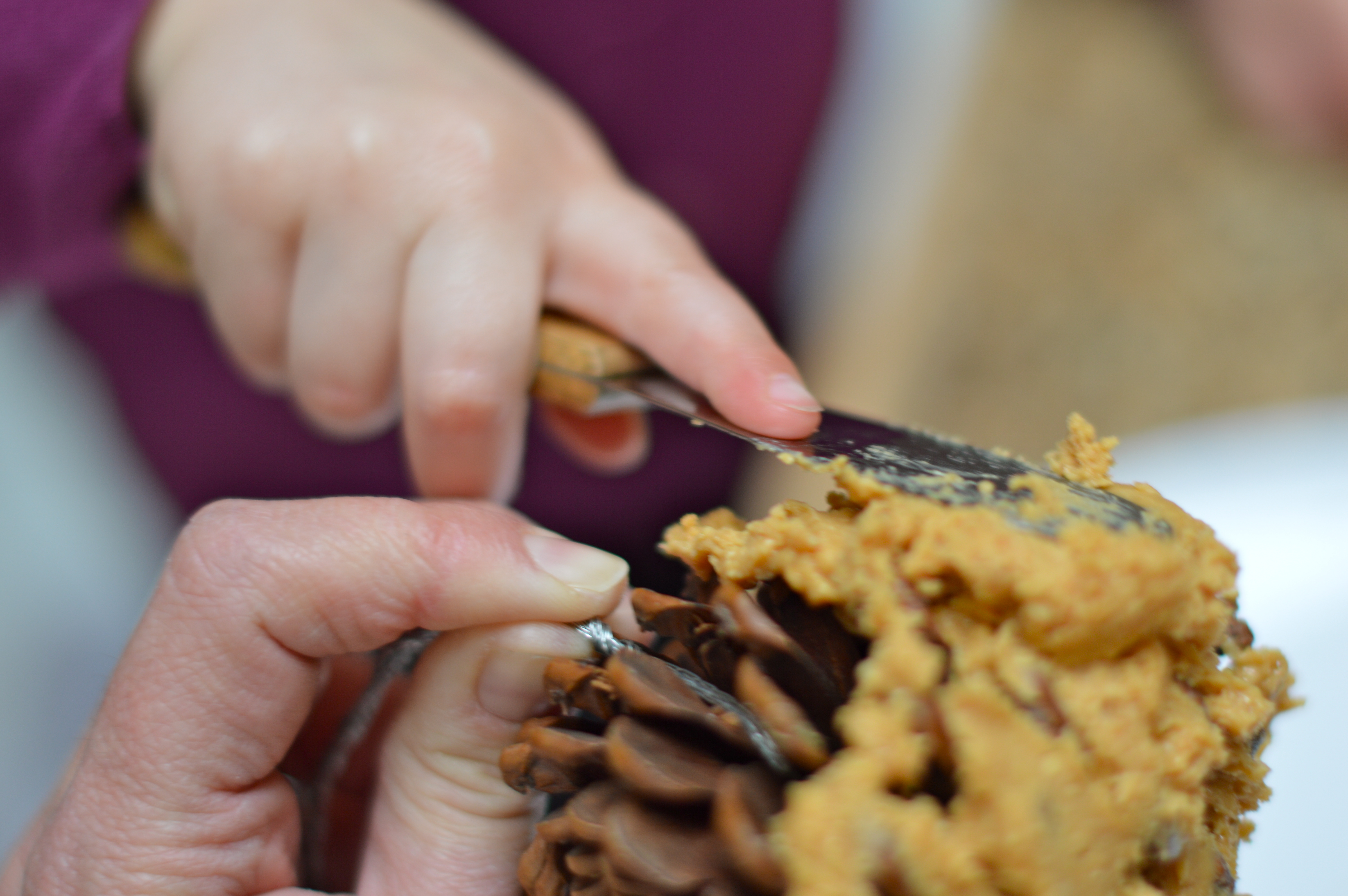 This is a quick and easy activity to do with the kids and it is so satisfying to see the birds (and squirrels) show up so regularly! We used peanut butter, a pine cone that we found outside, and a birdseed mix from our local hardware store. You can use any mix of peanut butter, vegetable shortening, or suet (a high-quality animal fat) and there are lots of choices of birdseeds. One tip we have learned is that wire is necessary to hang the pine cone. In years past, we have very hopefully hung our pine cones with string or yarn and were quickly thwarted by motivated squirrels that will bite through the string and steal the whole bird feeder! So far, the wire has worked like a charm.