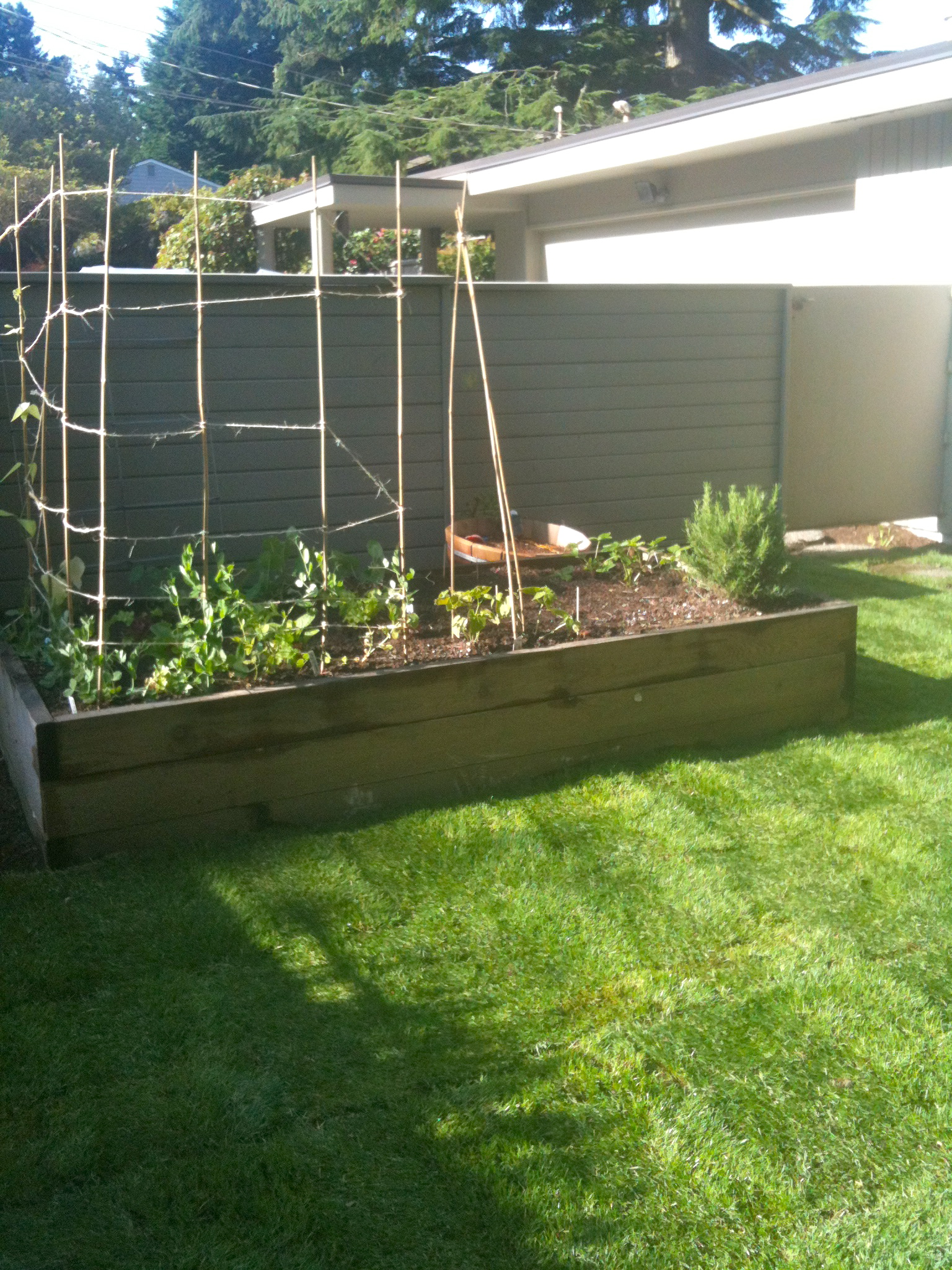 There can be beauty in the imperfections… I might wish that I felt more comfortable with this statement, but I am a selective perfectionist. This means that in some things I am very relaxed, but in others I can become paralyzed if I cannot get a project to meet my expectations. Thankfully, my husband and I are well-paired in this arena. Where I stall out, he moves forward with gusto. Our garden this year is a perfect example of how beauty and joy can come from unexpected imperfections. This is our second year planting a vegetable patch. Last year was a bit of a bust. We were novices with high expectations. We started the season in a flurry of energy and completely fell off as the summer progressed. This year, with new baby and a busy life, I entered with moderate expectations. We planted tentatively and sparingly… still, I stalled out when I couldn’t come up with an aesthetically appealing plan for my vertical peas. I was ready to throw in the towel. Thankfully Gus stepped in and made it happen. He also had big plans for our tomatoes. I hate the way the tomato planters look. There, I said it. They are planted in rubbermaid totes and are pretty ugly – but, as you will see, quite impressive.