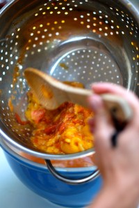 Dump the tomato solids into the bowl and place a sieve over the bowl (I didn’t have one of these, so I used my colander.) Pour the apple and lemon mixture into the sieve and press as much of the juice and apple pulp through the sieve as you can. Discard the solids in the sieve.
