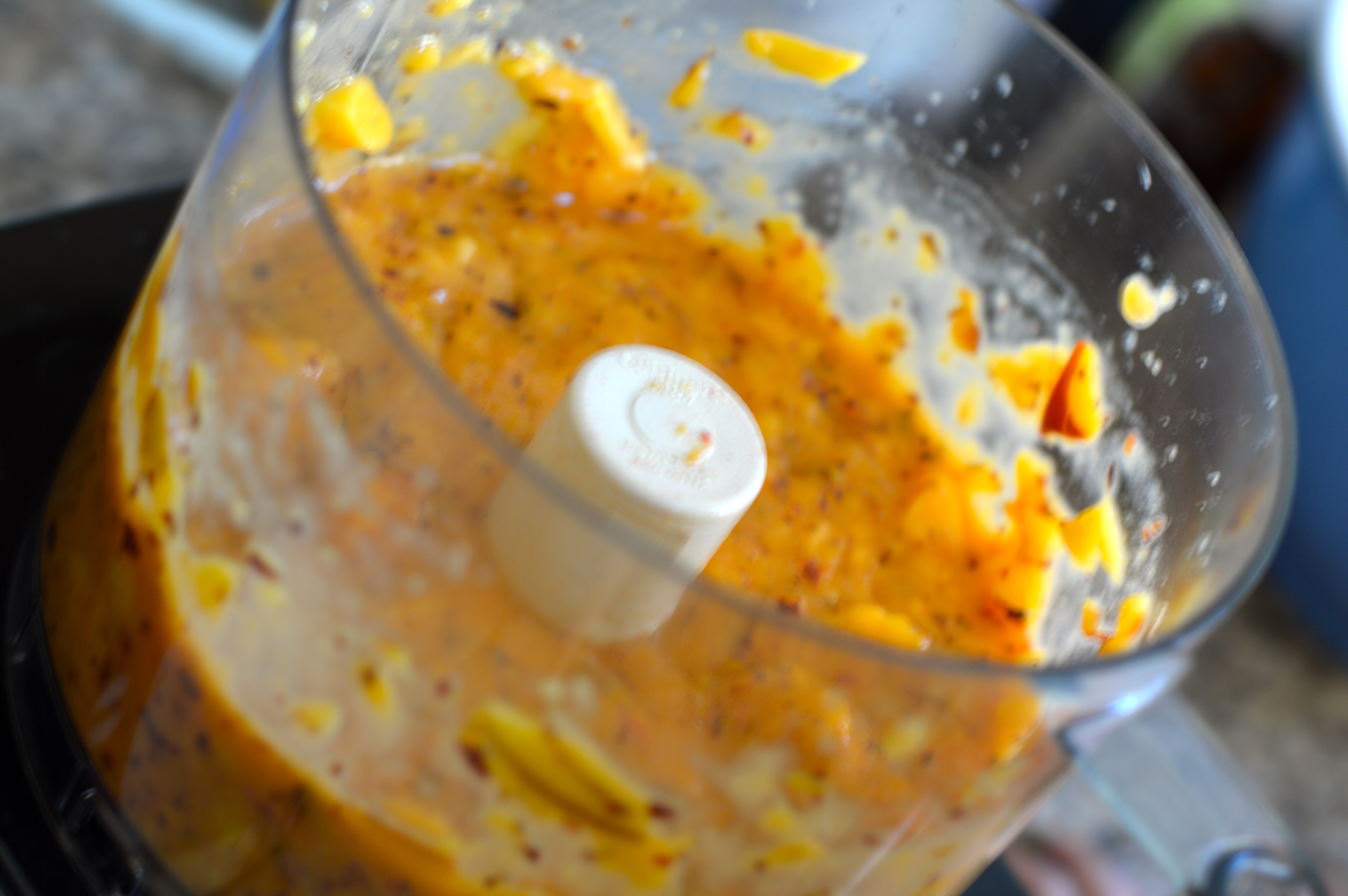 1. Put peach halves into the bowl of a food processor fitted with the chopping blade. Pulse peaches until rough/finely chopped (depending on preference). Reserve in bowl.