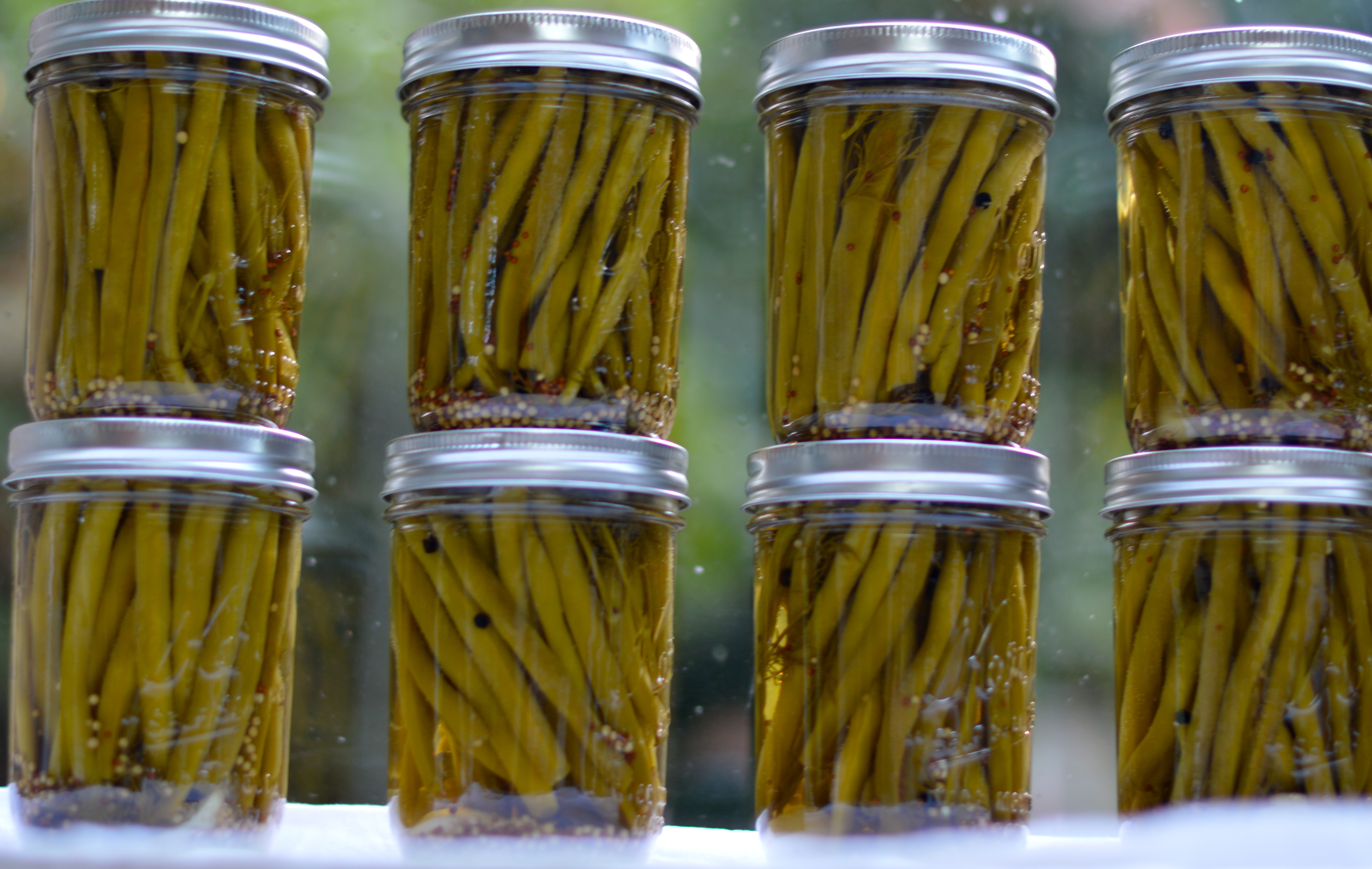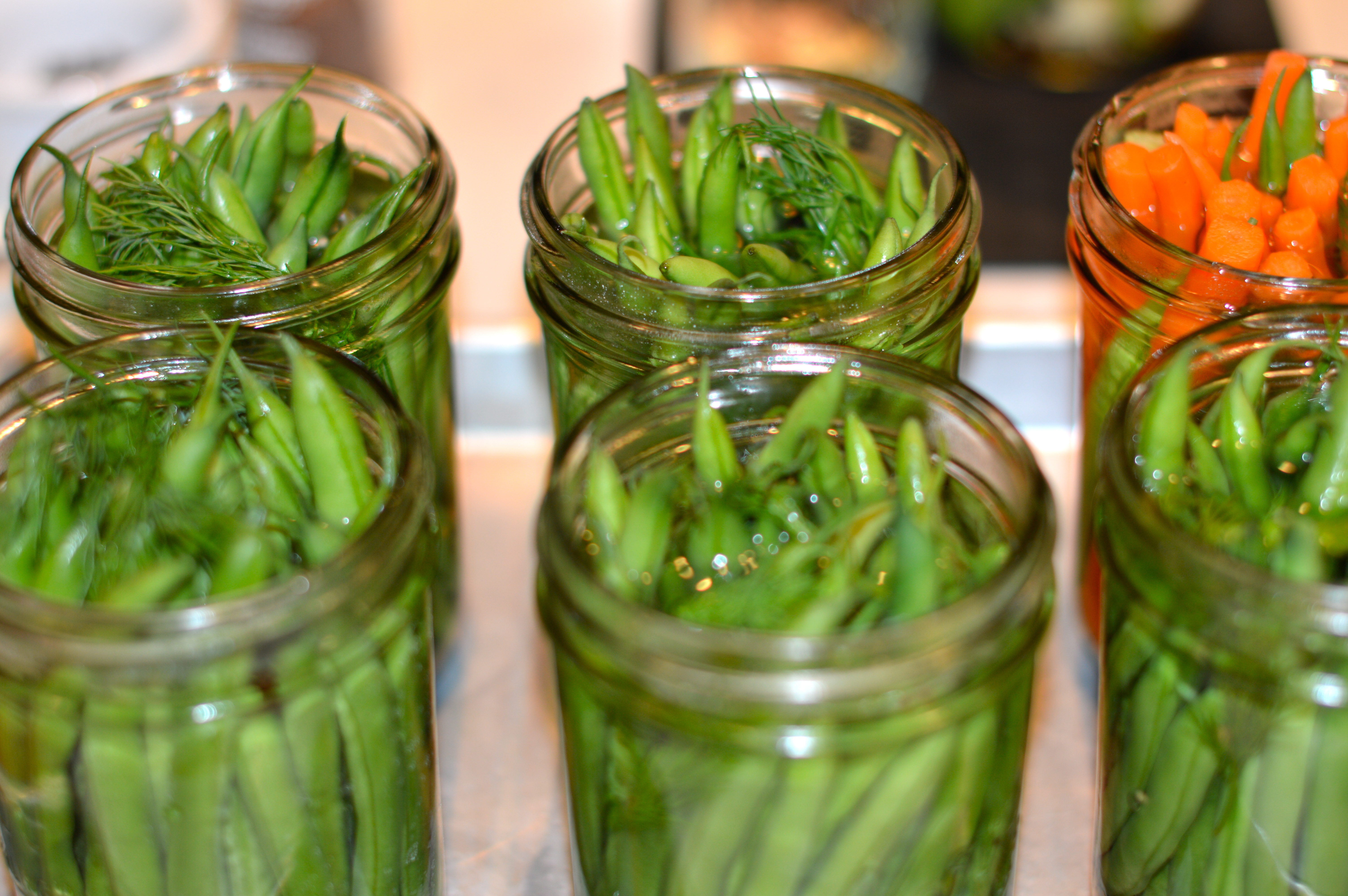Pickled beans have always been a favorite of mine. I remember once when I was about 12, we went to a silent auction and the only thing I wanted to bid on, besides a flourescent pink ski parka, were the pickled green beans. I remember savoring that jar of beans. Weird how those memories can stay with you. Anyway, since then I have been pickling my own green beans and am excited to share my favorite recipe with you! This recipe comes from one of my favorite canning books, Tart and Sweet: 101 Canning and Pickling Recipes for the Modern Kitchen by Kelly Geary and Jessie Knadler. I have mentioned this book before, because it is one of my favorites for a quick and dirty lesson on canning and the recipes included both capture the traditional as well as the innovative.